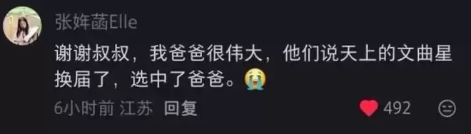 或许的看到了大家的留言,张雪峰女儿张姩菡还公开回应了,张姩菡谢谢大家,她说爸爸很伟大,他们说天上的文曲星换届了,选中了爸爸。