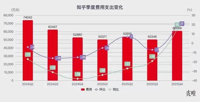2025 年第四季度,知乎营业总成本 3 亿元,同比下降 6.2%,主要来自人员相关开支的缩减;销售及营销开支 2.75 亿元,同比下降 13%;研发开支 1.23 亿元,同比下降 16%。