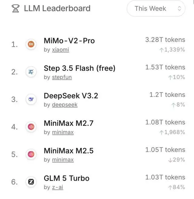 小米也凭借MiMo-V2-Pro的出色表现,与智谱、MiniMax、阶跃星辰、DeepSeek等一众国产大模型厂商包揽周榜前六名。