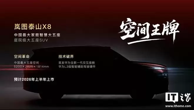 另根据最新此前的预热海报来看,岚图泰山 X8 的尺寸为 5200×2025×1814mm,定位“庭院级大五座 SUV”,将首发华为全新一代交互座舱、华为 L3 级智能辅助驾驶硬件,预计 2026 年上半年上市。