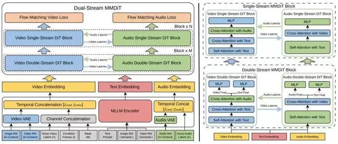 首先也是最关键的变化:其从底层架构重写音视频生成方式,采用原生音画一体的双流 MMDiT 架构,替代「先画面、后音频」的串行方式,将音视频在同一语义空间中联合建模。