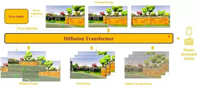 长时序稳定性层面引入 Error Buffer 机制,显式建模生成帧与真实帧之间的误差,并作为条件回注模型;同时通过对历史帧进行误差扰动训练,让模型在训练阶段就习惯偏差,在推理时具备抗误差累积能力,避免随时间推移出现结构漂移与内容崩坏。