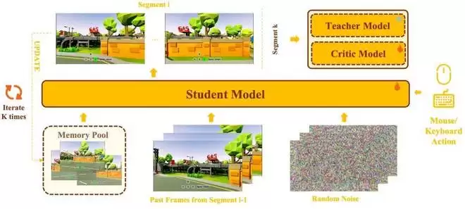 Matrix-Game 3.0 采用具备长期记忆能力、且能够抵抗误差累积的基础模型作为教师模型进行蒸馏,并利用「上一段输出作为下一段输入」的多段式联合训练,强化模型长时序连续推理能力,使其在生成过程中能够保持记忆与稳定性。同时结合模型量化与 VAE decoder 蒸馏等优化手段,将模型压缩至约 5B 规模,并在 720p 分辨率下实现实时生成