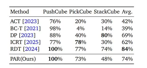 在PickCube与StackCube任务上,同样超过或接近需要动作预训练的强基准方法