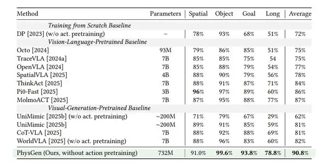图3:732M参数、在零大规模动作预训练的前提下,Physgen取得平均90.8%成功率