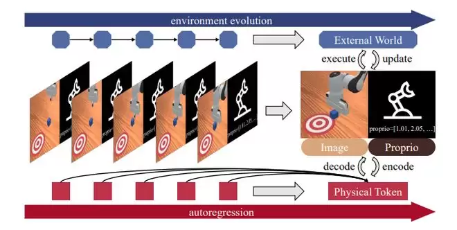 图1:物理token自回归的运作方式:预测未来的帧与动作联合体,与真实环境同步演化