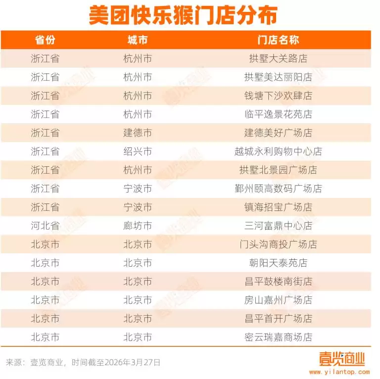 据壹览商业统计,随着这3家门店落地,美团快乐猴目前至少有16家门店正式投入运营。从区域分布来看,浙江省是其大本营之一,共有9家门店,5家位于杭州、2家位于宁波、建德市和绍兴市各有1家门店;北京市紧随其后,拥有6家门店;河北省则有1家。
