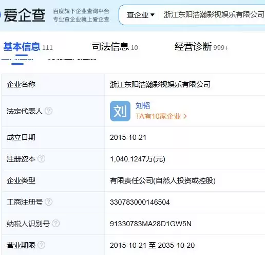 其实,这都是华谊兄弟的子公司,浩瀚影视于2015年成立,老板叫刘韬,华谊兄弟占股49.25%,是最大股东。