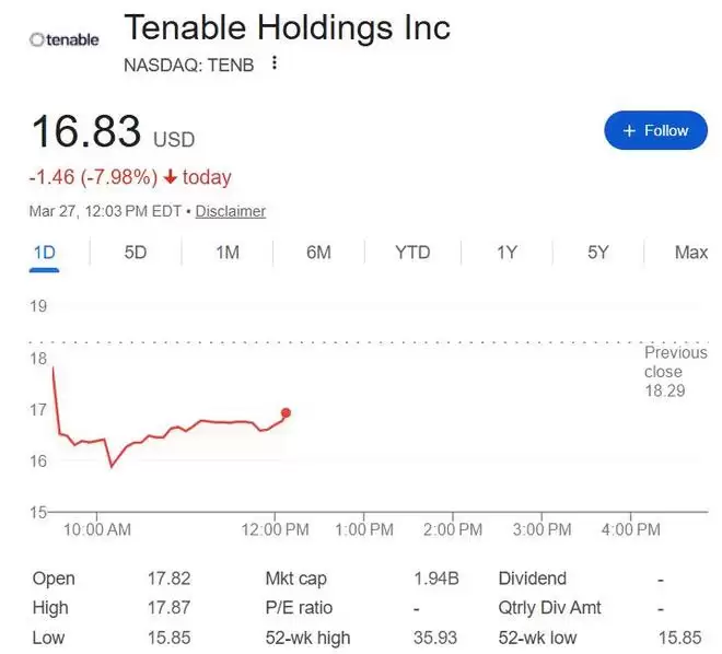 周五美股早盘,Tenable一度跌逾13%,Zscaler曾跌超9.5%,Palo Alto Networks曾跌逾8.2%,CrowdStrike曾跌超7.8%,后跌势缓和,Tenable跌约8%,后三者跌幅收窄到6%以内。