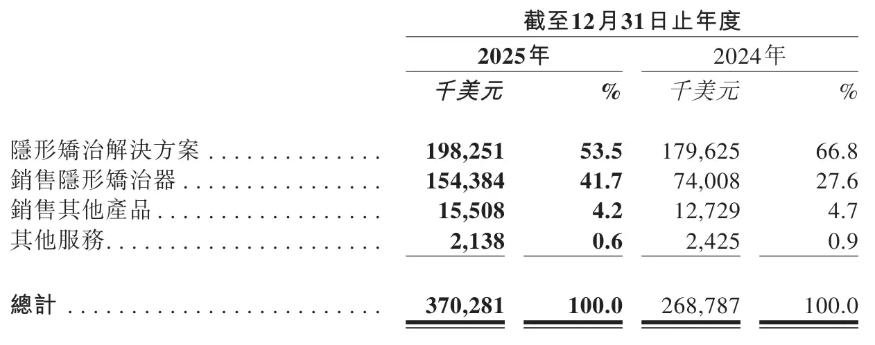 时代天使2025年隐形矫治解决方案1.98亿美元,占营收的比例为53.5%;上年同期为1.8亿美元,占营收的比例为66.8%。