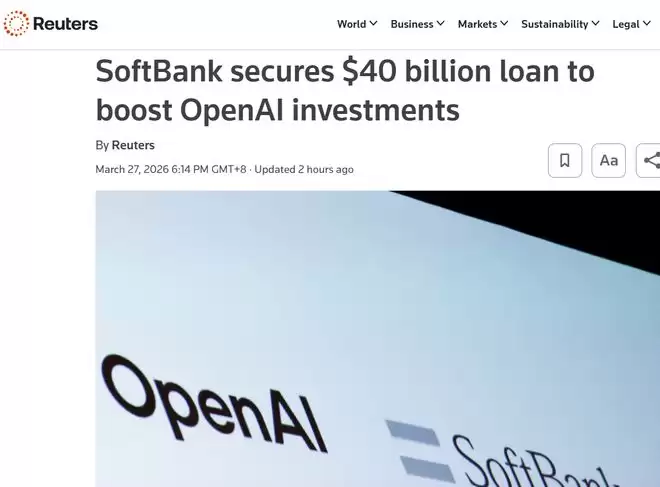 【环球网科技综合报道】3月28日消息,据路透社报道,软银集团正式宣布,已获得一笔400亿美元无担保过桥贷款,主要用于加码对OpenAI的投资及企业日常运营,进一步推进其AI战略布局。