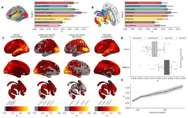 TRIBE v2 预测大脑在皮层和皮层下区域的活动。预测质量因刺激类型而异,明显优于线性基线。随着训练数据的增加,准确性稳步提升(右下角)。| 图源:Meta