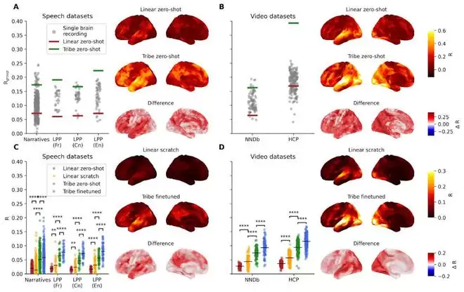 在性能表现上,TRIBE v2 的预测结果比单人真实的脑扫描图更清晰。真实的功能性磁共振成像(fMRI)常受心跳、头部微动等噪音干扰,TRIBE v2 通过直接预测“调整后的平均反应”来消除杂音。实验表明,其预测准确度远超传统线性模型,并成功在计算机上复现了大量经典神经科学实验。