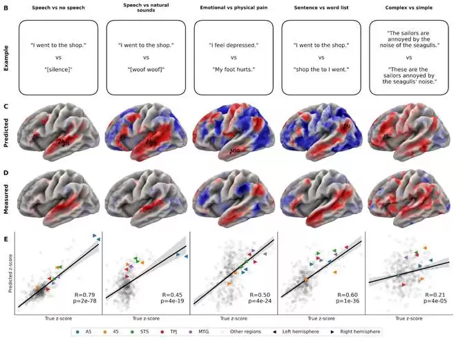 在语言实验中,TRIBE v2 复制了经典的神经语言学发现,如言语与沉默、情感与身体疼痛,或句子与词汇列表的区分。预测的激活模式与测量数据相符。| 图源:Meta