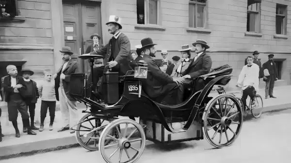 电动车悠闲地出行:1899年,由亨舍尔公司制造的最早的电动汽车之一行驶在柏林的街道上。