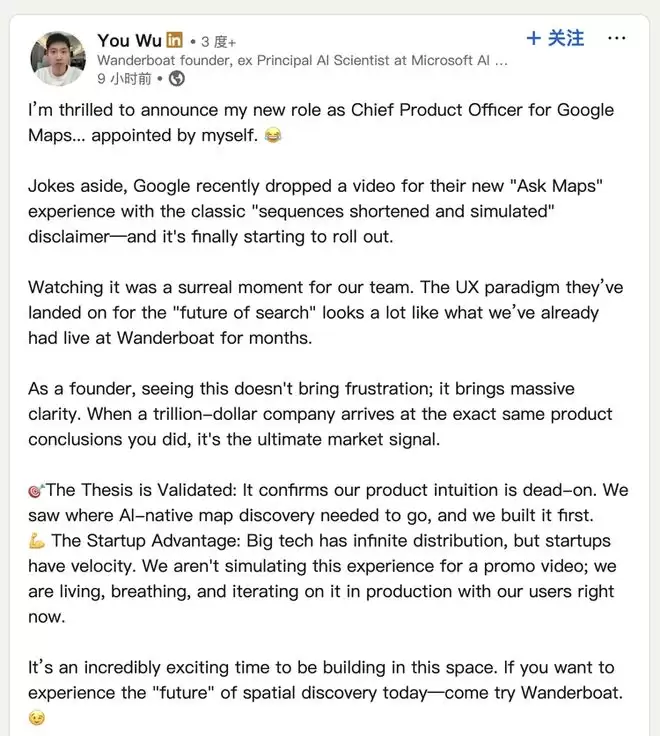而就在Google的这个demo发布后,Wanderboat的CEO Wu You 也在社交媒体上吐槽,他开玩笑地表示: