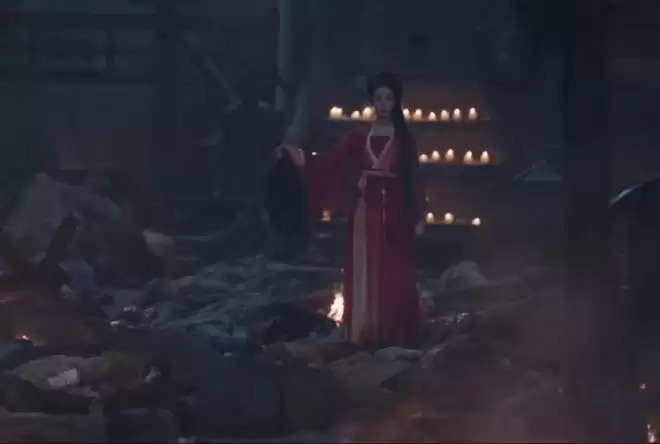 被敌军脚踏过后的破城中,贺思慕一袭红衣走在满是尸体的街道上,手里还拎着不小心拽下来的脑袋,诡异、阴森、又极具视觉冲击力。