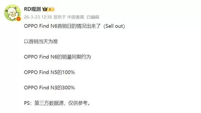 看完荣耀Magic V6的首销情况,我们再来看OPPO Find N6的。根据行业人士提供的数据OPPO Find N6首销当天约为上一代OPPO Find N5的100%,是上上一代OPPO Find N3的300%。也就是讲达到了上一代的水平,是上上一代的3倍。可以讲OPPO Find N6这个表现相当不错了,要知道这一代整体售价还上涨了1000块,起步价来到近万元。