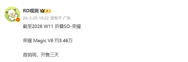 荣耀Magic V6首销三天达到了上一代荣耀Magic V5同样开售三天的75%,是上上一代荣耀Magic V3同样开售3天的101%。针对这个销量行业人士认为今年情况非常特殊 ,整体市场会有一定程度的下跌,且荣耀Magic V6有很多版本都在缺货中,所以这个表现还是不错的。