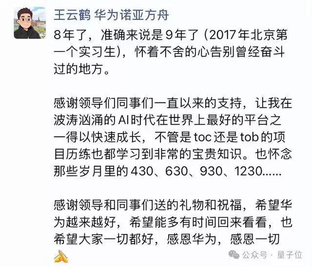 智东西作者|江宇编辑|冰倩智东西3月28日报道,今日,华为诺亚方舟实验室主任、华为盘古大模型负责人王云鹤在朋友圈发文,确认离职。王云鹤于2017年以华为北京部门首位实习生身份加入,至今已接近9年。在
