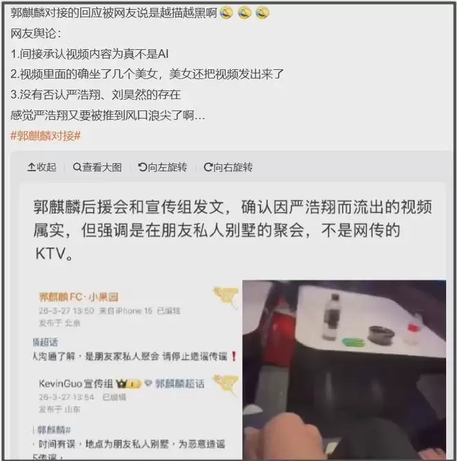 郭麒麟粉丝对接上来就确认了爆料画面的真实性,认下了画面中出现的男子是郭麒麟,强调他们没有去商K,而是去朋友家别墅参加私人聚会,刘昊然粉丝后援会同样认可了爆料画面真实性,强调刘昊然从未进入网传场合,也就是商K。