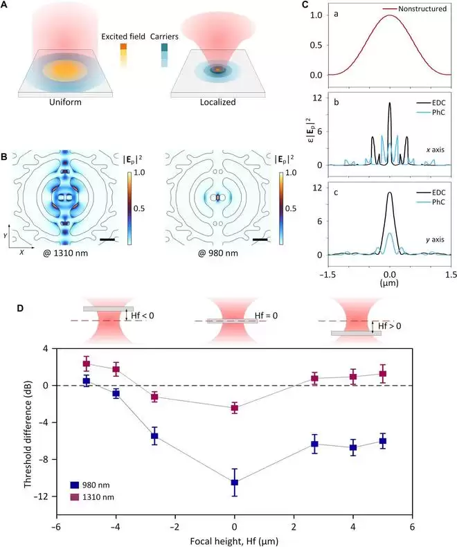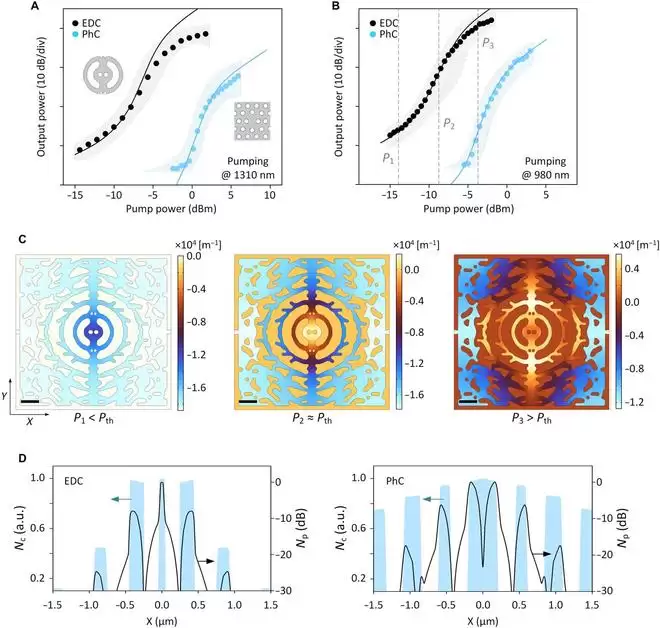 该纳米激光器的核心技术,在于一种名为“纳米谐振腔”(Nanocavity)的捕光结构,类似一个极小的“光线陷阱”或“回音壁”,把光线牢牢锁在特定区域内,从而在极低能耗下产生激光。外部光束激活后,光和电子会被限制在极小区域内,从而让激光器能在室温下低耗能运行。