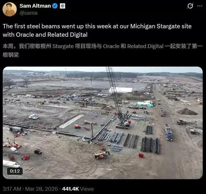 3月28日,奥特曼在社交平台上低调宣布:位于密歇根州的「星际之门(Stargate)」超级计算中心项目正式开工。