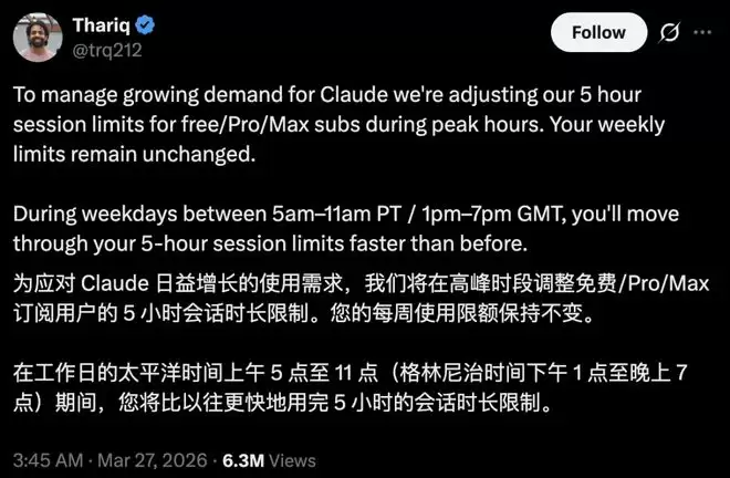 Anthropic方面表示,从本周起,在太平洋时间早上5点到11点的高峰时段,Claude用户会更快触及5小时会话上限。