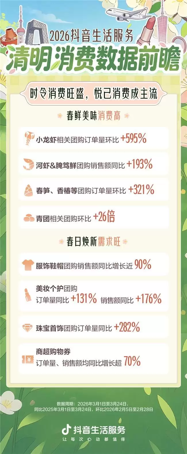 随着气温回升,春日消费热潮全面来袭,清明假期临近更助推出游、体验、餐饮等多领域消费持续走高。抖音生活服务发布的“清明消费数据前瞻”显示,3月以来平台春日相关消费热度飙升,线上流量持续转化为线下消费产值,赏花踏青、酒旅出行、体验式消费、时令餐饮等成为春日消费主流,上海、北京、广州、深圳、郑州位列清明节前抖音酒旅消费城市前五,春日经济呈现多点开花的繁荣态势。