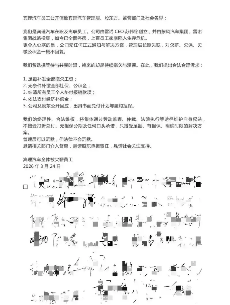 3月27日,有媒体报道称,宾理汽车在职及离职员工发布联合声明,称公司已全面停止运营。声明显示,尽管曾获得雷诺、东风等企业的战略投资,宾理汽车仍最终倒闭,致使数百名员工及家庭因欠薪陷入生存困境。