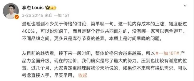 按照李杰的说法,从目前的趋势看,接下来一段时间,整体价格只会越来越高。所以一加15T产品力全面升级,现在的定价,是尽了最大的努力,压到也比较有诚意的位置。过几个月,大家肯定更能理解。