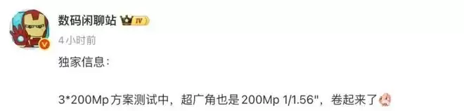 博主@数码闲聊站 的一份爆料中提到“3*200Mp方案测试中,超广角也是200Mp 1/1.56",卷起来了”。