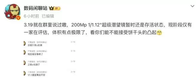 今天,博主@数码闲聊站 的一份新消息中提到,200Mp 1/1.12"超级潜望镜暂时还是存活状态,现阶段仅有一家在评估。