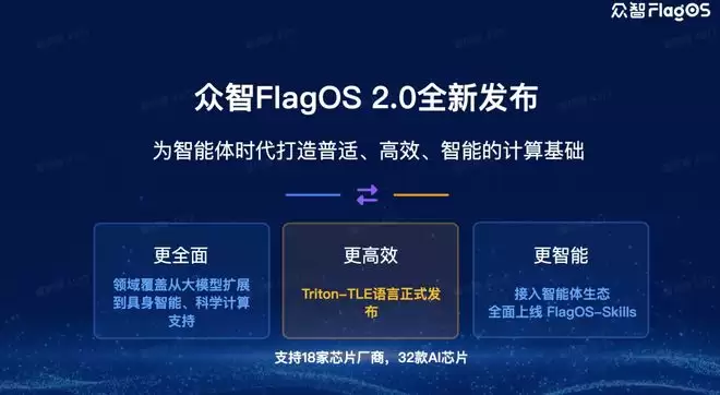 从技术形态上看,这次发布的众智FlagOS 2.0不再只是服务于大模型训练与推理的工具集合,而是一个面向多芯片、多场景的统一系统软件栈。它由包括北京智源研究院、中科院计算所、清华大学、北京大学、硅基流动、摩尔线程在内的等23家机构共同完成,支持18家厂商、32款AI芯片,覆盖从数据中心到边缘、再到机器人等多种应用场景 。这意味着,在当前高度割裂的算力生态中,FlagOS试图构建一种“跨芯片通用层”,让不同硬件之间具备可迁移、可复用的能力。