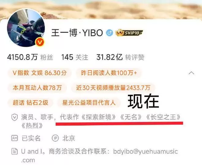 他将使用多年的UNIQ-王一博正式改为王一博・YIBO,彻底去掉UNIQ前缀,认证中也删除了UNIQ组合成员标签只保留演员、歌手身份,并新增代表作《探索新境》。