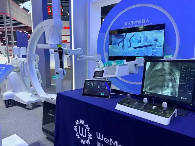 在唯迈医疗展台,一款率先上市且具备“力反馈”功能的国产自研冠脉介入手术机器人,可以实时采集器械与血管壁的相互作用力,将信号无延迟反馈给医生,其最小力的感知精度达到0.01N,相当于1克重。不仅如此,该系统支持隔室操作,医生得以脱掉铅衣,从根本上减少辐射暴露,还能准确感知器械在血管中的真实状态,从而规避导丝误入风险,提升手术精度和安全性。