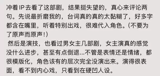 台词:声音矫揉造作,台词黏糊,吐词不够清晰,像含在嘴里,听着容易出戏,难以代入角色。