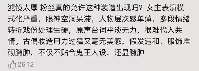 服化道:服装过于沉闷;发包太大显头大,假发违和,服饰堆砌臃肿,不贴鬼王人设;妆容也不精致,把人化老了。