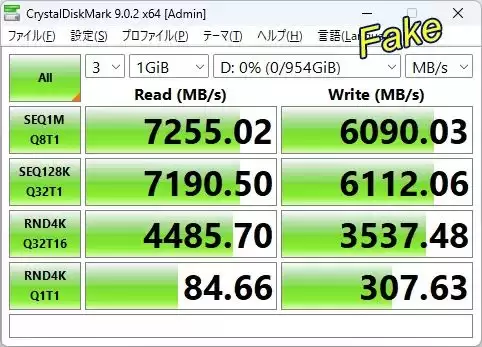 而这次测试的假冒 1TB 三星 990 Pro 则更加逼真。在 CrystalDiskInfo 跑分中,这块假盘显示读取速度 7255MB/s、写入速度 6090MB/s,已经非常接近正品 990 Pro 的 7453MB/s 和 6953MB/s。