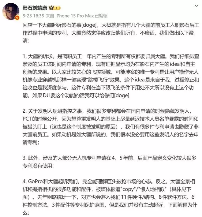 他在回应里举了一个具体例子:起诉专利里有一件"跳楼飞行"功能,刘靖康说这个idea是他本人提出的,研发过程深度参与,最后调侃道:"如果DJI要这个功能的话我可以给你们。"