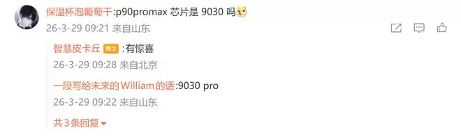 后续有用户在评论区询问:“p90promax 芯片是 9030 吗 [狗头斜眼]”,博主回复道:“有惊喜”;另一名用户则询问道:“超大大杯没有了嘛 [捂脸笑哭]”,博主则回复道:“pm”。
