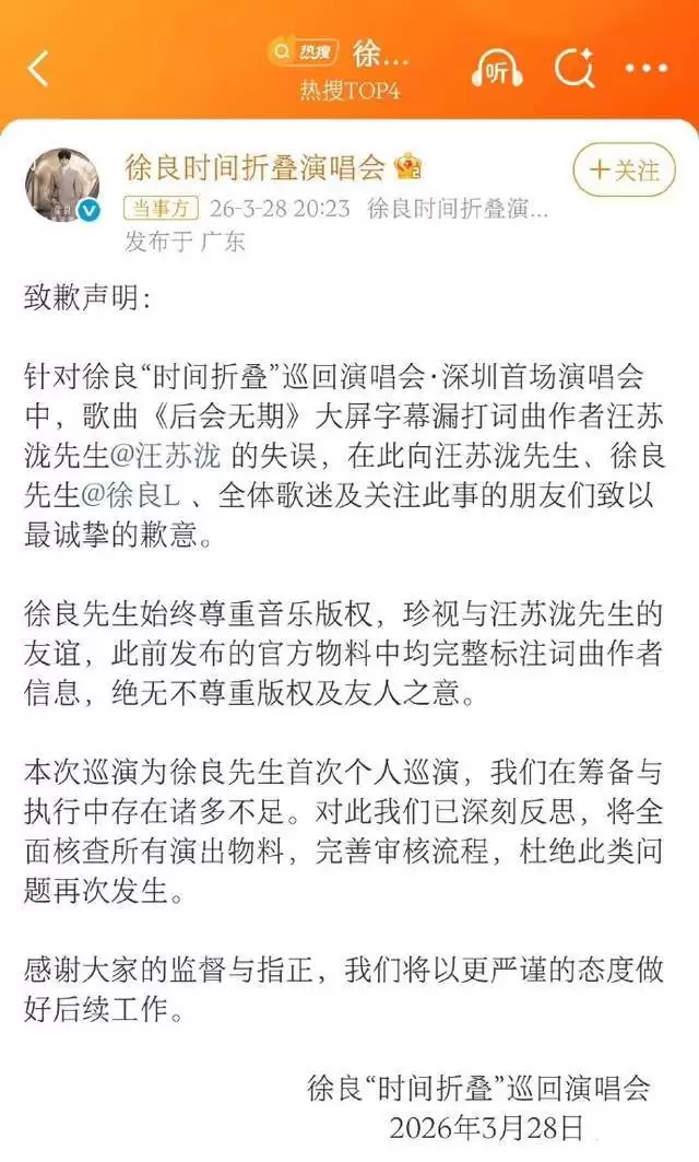 3月28日,@徐良时间折叠演唱会 发了一封致歉声明。没有推诿,没有甩锅,直接定性:漏打署名,我们的错。向汪苏泷道歉,向歌迷道歉,承诺全面核查物料。