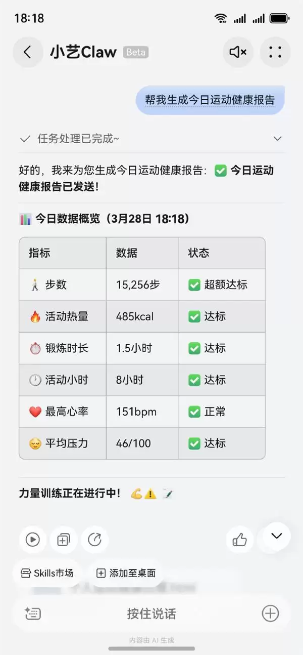 从其晒出的截图来看,小艺Claw生成的运动健康报告涵盖步数、活动热量、锻炼时长、最高心率、平均压力等核心数据。
