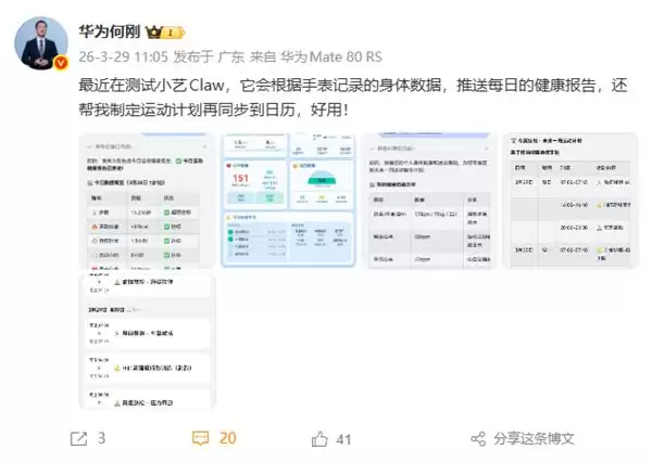 今日,华为终端BG首席执行官何刚微博发文表示:"最近在测试小艺Claw,它会根据手表记录的身体数据,推送每日的健康报告,还帮我制定运动计划再同步到日历,好用!"