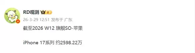 现实之中这波存储涨价国产品牌几乎全部受到了影响,反而是苹果这个品牌不仅没有受到影响,同比还在增长中。不信大家可以查询一下行业人士“智慧芯片案内人”提供的国内2026年1-12周同比2025年的数据,这个数据显示苹果同比增长高达17%。国产品牌仅OPPO系同比在增长,不过同比增长仅2%,剩下四个国产大品牌同比全部在下跌之中。更令人气愤的是iPhone 17系列自国内正式商用,就一直在热卖之中。这不来自行业人士“RD观测”的数据显示截至W12周,iPhone 17系列在国内的整体销量已经达到2598.22万台,马上就会突破2600万台,这是一个非常恐怖的数据。