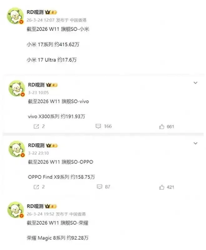 为什么这么讲呢?作为对比vivo X300系列+OPPO Find X9系列截至W11周的累计销量还不及iPhone 17系列的零头;而小米17系列一家也是不及人家零头的,更不要讲荣耀Magic8系列了。这么讲吧!国产五大品牌当家机型加在一起都不是iPhone 17系列的对手,且差距至少在1000万台左右。怪不得行业讲国产机型售价无限接近iPhone 17系列,销量却无限远离iPhone 17系列,看似扎心却是不可争议地事实存在的事。何况这一波国产个别品牌的涨价,也算是直接送了iPhone 17系列一个大礼,这个事实太扎了。