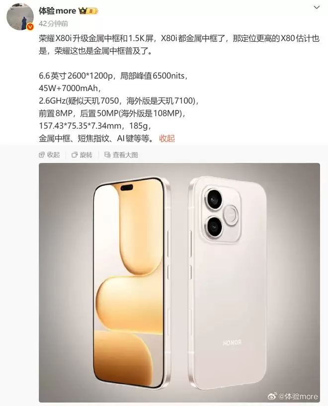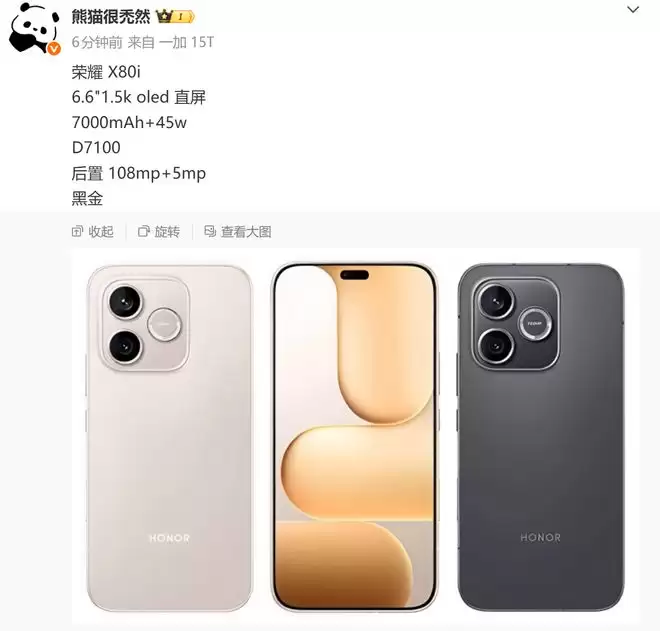 IT之家 3 月 29 日消息,博主 @熊猫很禿然 今天在微博发文,曝光荣耀 X80i 手机的详细配置。