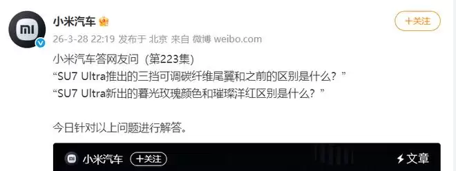 【环球网科技综合报道】3月29日消息,小米汽车日前发布答网友问,回答了“SU7 Ultra 推出的三挡可调碳纤维尾翼和之前的区别是什么?”等问题。