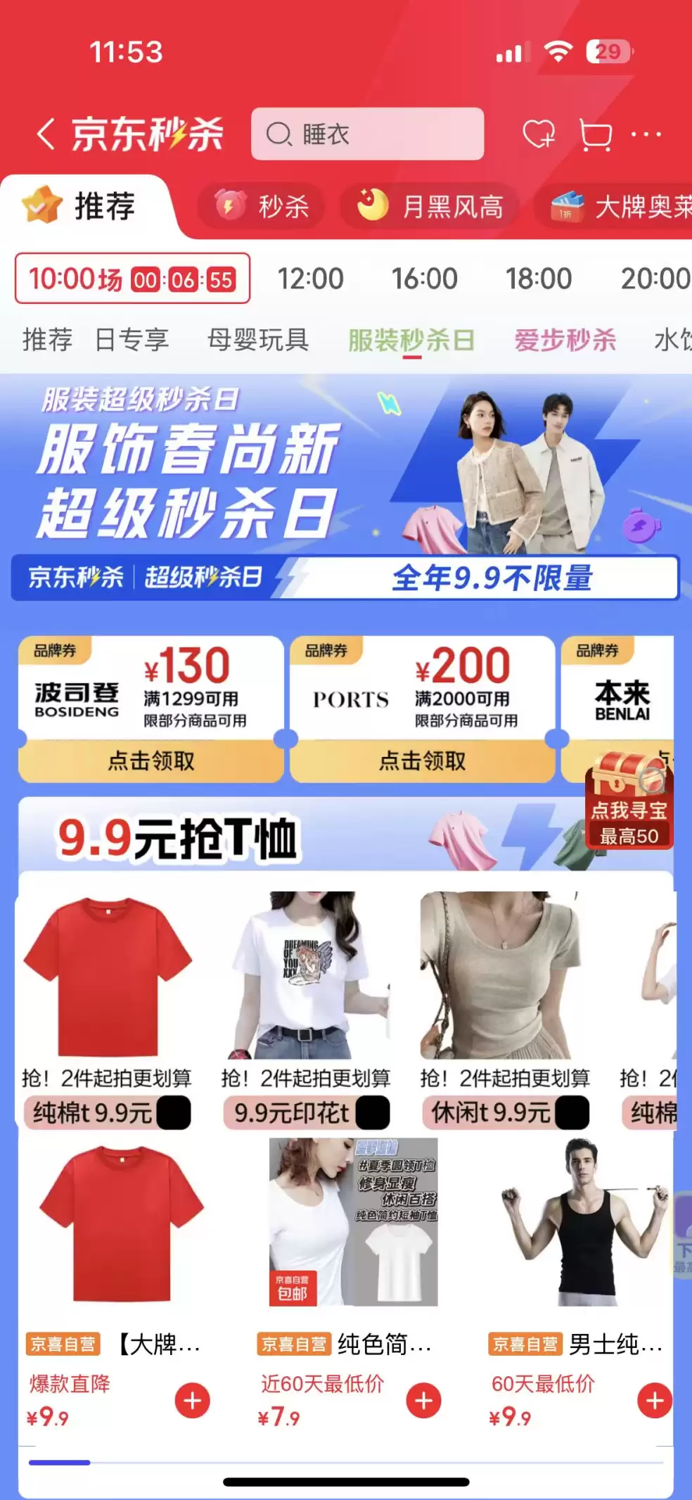 京东春尚服饰秒杀:9.9元短袖买一送一,限时开抢
