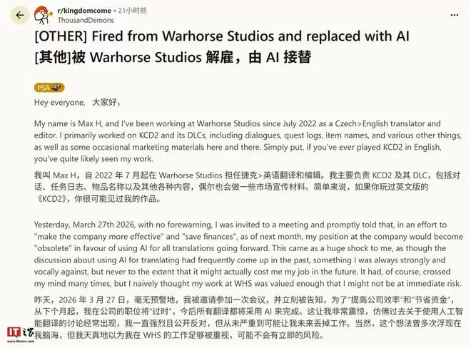 IT之家 3 月 29 日消息,Warhorse Studios 工作室开发人员 Max Hejtmánek 昨天在 Reddit 论坛发文称,自己即将被公司解雇,原因是 AI 取代了他的岗位。